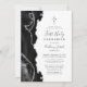 A borda esquerda deste elegante e moderno convite da primeira comunhão apresenta uma aquarela preta, borda agitada, aparada com cintilação de prata. Uma cruz de folha de alumínio prateada aparece acima do texto personalizável, que combina escrita manual, chapa de impressão e fontes itálicas em cinzas de carvão em um fundo branco. O verso apresenta um design de agata preto e prateado correspondente. Ideal para a Primeira Comunhão de um menino.