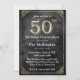 Este convite de festas personalizado apresenta um tema de aniversário de 50 anos no estilo vintage. O fundo apresenta um padrão de papel-pergaminho preto rústico e esmaecido. Um quadro de ouro de estilo antigo borda o convite. O quinquagésimo ano é impresso num design de folha de ouro, seguido das informações e localização do evento. É perfeito para um aniversário, aniversário ou outra ocasião especial.