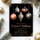 Host a festive and stylish ornament exchange with this luxurious black and rose gold invitation. This design features a rich black background adorned with shimmering rose gold accents and five intricately illustrated hanging ornaments, each showcasing floral, snowflake and geometric patterns. This elegant layout sets the tone for a warm and celebratory seasonal gathering. Perfect for holiday swaps, office events or cozy get-togethers with friends and family.