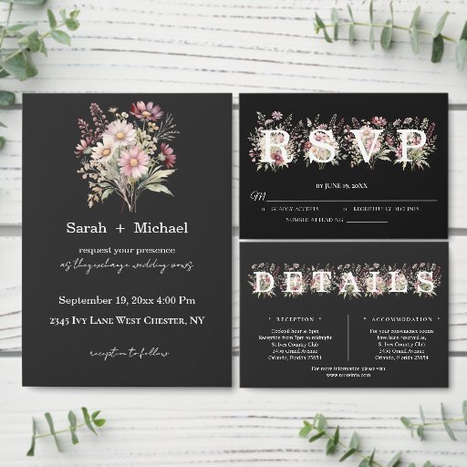 Convites Black and White Spring Floral Wedding Invitation