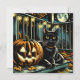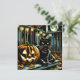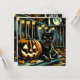 Convites de festas de Halloween. Gato Negro sentado em uma varanda frontal perto de uma abóbora esculpida com uma lua de cheio no fundo.