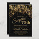 75.º convite de aniversário para mulheres com luzes de cordas de ouro reluzentes e espumantes sobre fundo negro ousado. Como o texto é personalizável, este convite é feito para uma senhora que comemora qualquer aniversário. (18, 21, rua, 30, 40, 50, 60, 70, 80, 90, 100...ou qualquer idade). Texto, fontes e texto são completamente personalizáveis. Entre em contato conosco para obter ajuda sobre a personalização ou produtos correspondentes.
