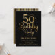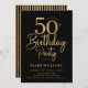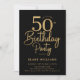 Black gold 50th birthday party invitation. Trendy modern design, perfect for a stylish men's or women's bday celebration. Features script font and stripes on the back. Customize with your own details. Printed Zazzle invitations or instant download digital printable template.