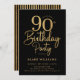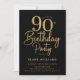 Black gold 90th birthday party invitation. Trendy modern design, perfect for a stylish men's or women's bday celebration. Features script font and stripes on the back. Customize with your own details. Printed Zazzle invitations or instant download digital printable template.