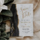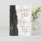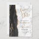 This elegant modern save the date card features a black watercolor agate geode border trimmed with faux gold glitter. The customizable text is gold and black on a gray and white marble background. The reverse side features a matching black and gold agate design.