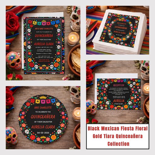 Celebrate your special day in style with this stunning black Mexican fiesta quinceañera invitation! Featuring vibrant floral accents, festive colors, and a chic gold tiara touch, this design blends tradition with modern elegance. Perfect for a bold and unforgettable 15th birthday celebration. Easily personalize with your details to match your unique party vibe!