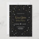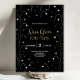 Black New Year invitation card with gold and silver stars and swirls. Text reads "New Year Kitty Party, December 31, 8:00 PM." Elegant and festive.