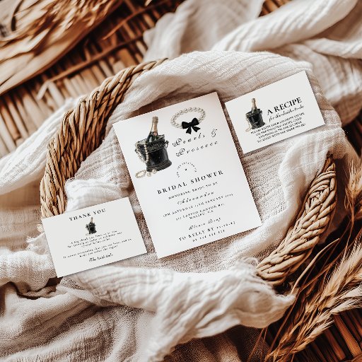 A modern and luxurious bridal shower design featuring a chic black satin bow, sparkling pearls, and a classy champagne glass illustration. The crisp white layout keeps the aesthetic refined while the bold black accents add a touch of glamour—perfect for a Pearls & Prosecco–themed celebration. This design sets the tone for an upscale, feminine, and unforgettable event your guests will love.