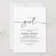 Este clássico branco preto é um convite para chás de fraldas de menina é perfeito para um chá de fraldas moderno ou borrifo. O design simples e elegante apresenta a tipografia de scripts clássicos e ricos em preto e branco.