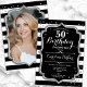 Elegante 50º convite de aniversário com sua foto no fundo do cartão. Design branco preto de vidro com prata brilhante. Apresenta faixas pretas e brancas, fontes de script e confetti. Perfeito para uma festa de comemoração de na moda adulto. Personalize com seus próprios detalhes. Pode ser personalizado para qualquer idade! Impressos convites Zazzle ou modelo de impressão digital instantânea para download.