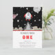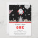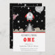 Um belo convite espacial de primeiro aniversário com uma ilustração de um navio-foguete decolando de um planeta, algumas estrelas e planetas sobre um fundo negro. Ilustrada e projetada por Patricia Alvarez.