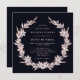 Este delicado e belo convite para o casamento apresenta um fundo escuro, quase preto, com uma coroa floral rosa e macia.