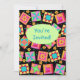Convide um amante de colcha ou colcha com este convite colorido de colcha totalmente personalizável. Personalize completamente na frente e atrás para adicionar suas próprias palavras, nomes e outras informações. Esta arte original de colcha faz um convite vibrante. A arte quilt baseada na arte original apresenta blocos de manta de retalhos favoritos mais blocos únicos em cores dinâmicas e vibrantes de laranja, amarelo, rosa, turquesa e verde limão sobre fundo preto para fazer as cores pop para uma bela paleta de cores. Um oval de verde limão está na frente do cartão para dizer "Você é Convidado" ou outras palavras da sua escolha. Mostre o seu amor por colchar com estas designs de arte colcha com outros produtos de arte colcha. A arte quilt é uma arte original da designer de tecidos e mantas Phyllis Dobbs e está em uma coleção de tecidos da Quilting Treasures. Esta arte está disponível em outros produtos e em vários planos coloridos. Há mais produtos disponíveis na loja Business da Phyllis com Flair. Corresponder com carimbos coordenadores, envelopes, adesivos e etiquetas de endereço de retorno.