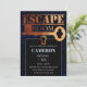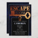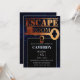 Este convite de festas personalizado apresenta um tema misterioso da sala de escape. O plano de fundo é um padrão binário de computador de cor azul em preto. Uma chave de cobre grande é impressa através do centro com uma trava de fechadura abaixo dela.
