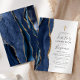 A borda esquerda deste elegante convite de primeira comunhão moderno apresenta uma borda azul de agata, aparada com falso brilho dourado. Uma cruz falsa de folha de ouro aparece acima do texto personalizável, que combina escrita manual, copperplate e fontes itálicas em cinzas de carvão em um fundo branco. O verso apresenta um design de agate azul e dourado correspondente.