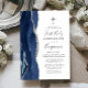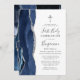 A borda esquerda deste elegante e moderno convite da primeira comunhão apresenta uma marinho azul de aquarela agata bordada com falso brilho prateado. Uma cruz de folha prateada falsa aparece acima do texto personalizável, que combina escrita manual, chapa e fontes itálicas em cinzas de carvão em um fundo branco. O verso apresenta um design azul marinho e agate prateado correspondentes.