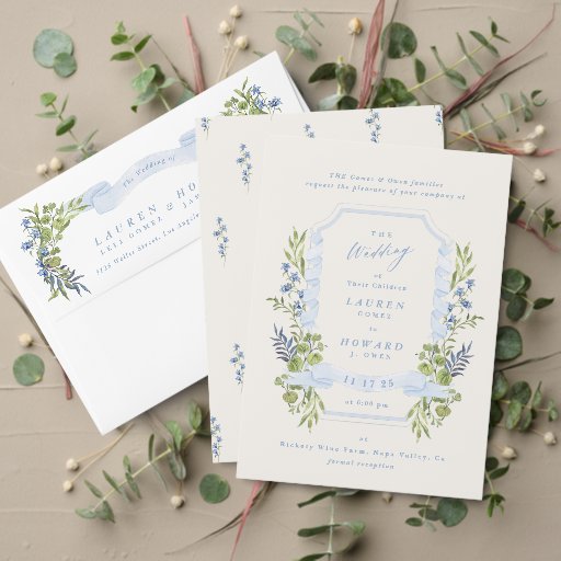 Convites blue and greenery garden crest wreath wedding