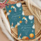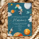This cheerful space invitation features an adventurous astronaut floating with watercolor planet balloons against a bright blue sky. Perfect for a first trip around the sun celebration, it brings a fun, whimsical cosmic vibe that’s ideal for little galaxy explorers.