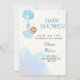 Celebrate your baby boy's arrival with this adorable baby shower invitation. Featuring a sweet illustration of a baby in a blue blanket carried by balloons and soft watercolor splashes, this design adds a whimsical and heartwarming touch to your special event. Perfect for boy-themed showers with a soft pastel palette and charming cartoon style.