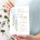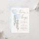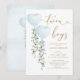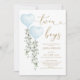 Este elegante convite para chás de fraldas apresenta eucalipto verde macio, dois balões azuis com cor d'água e inscrições modernas.