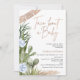Blue Boho Fiesta Taco Bout Um Chá de fraldas de Bebê Convite para Taco Moderno sobre um convite para chá de chá de fraldas com alguns cactos, suculentos e flores de cor azul-bebê e banner de ouro falso rosa e cabeçalho de caligrafia. Este chá de fraldas temático do cacto tem um sentimento boêmico e é ideal para o chá de fraldas do menino.