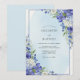 This design features a serene watercolor wash in soft blues, accented by a cascade of vibrant blue and white blossoms. Delicate greenery intertwines with lush floral clusters, creating an elegant and romantic atmosphere. The palette evokes a tranquil yet joyful mood.