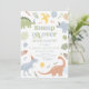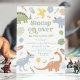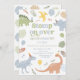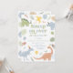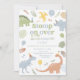 Convite de aniversário para dinossauros lindos, com dinossauros desenhados à mão, balões e folhas tropicais em cores pastéis moles de verde, azul, pêssego e amarelo. Uma design divertida e neutra do ponto de vista do gênero perfeita para um segundo aniversário ou qualquer festa com dino tema. Moderno, caprichoso e fácil de personalizar.