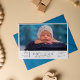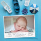 Foto poste convite para chá de fraldas de nascimento em design azul e branco limpo com foco em uma foto do seu bebê recém-nascido.