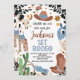 Blue Brown Saddle Primeiro primeiro aniversario Rodeio Convite para o primeiro primeiro aniversario rodeado de um rapaz bonito com botas de cowboy, chapéu de cowboy, algumas cordas, cacto, crachá do xerife e padrão de impressão de vaca negra.