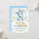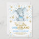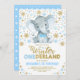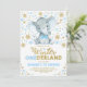 Primeiro convite para o aniversário, de um lindo bebê elefante, flocos de neve azuis e dourados, estrelas de brilho falso e sprinkles de confete