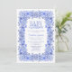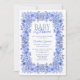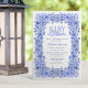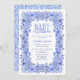 Digam "oui" para estilar com este design de flor silvestre, azul e branca! Desenhado de padrões chineses elegantes e de filmes florais franceses, ecoa o aspecto da porcelana de gengibre clássica e do brinquedo elegante. É só para esquinas de verão, brunches de jardim chic, ou qualquer evento com um tema azul clássico. Personalize agora para adicionar um toque de charme de eterno ao seu evento.