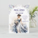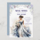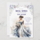 A watercolour blue floral modern design Bridal Shower Invitation. This floral invitation features a young bride-to-be in a feminine blue dress holding a bouquet of cream roses. The theme is romance and a radiant future.