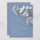 This elegant wedding invitation features AI created white 3 dimensional blue and gold flowers on a dusty blue background.