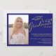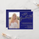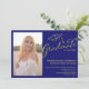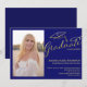Celebrate your graduate with this elegant blue and gold script photo graduation party invitation. Featuring a bold royal blue background, modern gold calligraphy typography, and a stylish mortarboard cap illustration, this design highlights your graduate’s photo beautifully. Personalize with the graduate’s name, school, class year, and party details. Perfect for high school or college graduation celebrations, this classic and modern design works wonderfully for school colors like navy and gold. A timeless announcement for family and friends to celebrate this special milestone.