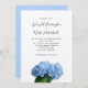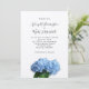 Convite de casamento simples e casual com design de flores azuis. A hidrangea realista floresce, com folhas verdes, decora o fundo das cartas de 5 x 7 polegadas. O texto preto é adicionado em quatro seções com nomes no script. A formulação é tradicional e é o ponto em que "por favor juntem-se" como primeira linha. O reverso é azul-claro sólido. Mostrado em um tipo de papel atualizado, que pode ser facilmente alterado.