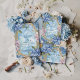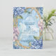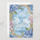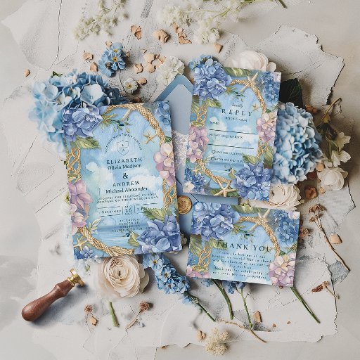 An elegant coastal wedding design featuring soft blue hydrangeas, woven nautical rope details, delicate seashell accents, and an airy ocean-toned watercolor background. The composition blends botanical romance with subtle seaside elements, creating a refined coastal look that feels timeless rather than themed.