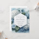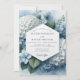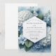 Delicate watercolor blooms in soft blues and whites create a dreamy, romantic atmosphere. Lush hydrangea blossoms mingle with subtle greenery, evoking a serene and elegant feel for your special day. This design captures a soft, whimsical mood.