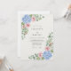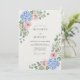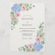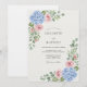 Soft blue hydrangeas and delicate blush pink roses intertwine with verdant greenery. This design evokes a romantic, painterly mood with its airy watercolor aesthetic.