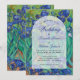 This floral invitation has as a background a irises painting by Van Gogh (now in the public domain).. The text is in a transparent white arch.. The occasion "Wedding" and the names are written in a blue elegant calligraphic script, the rest in small black caps.
