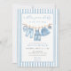 The COLBY blue jean baby shower invite design features a white and light blue denim stripes background with a clothesline full of denim baby clothes, bib and denim baby sneakers, paired with the phrase 'a blue jean baby is on the way' in a light blue script and serif font pair, with the other blue jean themed baby shower details in grey to your blue jean baby shower invitation. Personalize this denim baby shower invitation by adding names, date, time, venue and other details. A back is included with a denim and white stripe pattern.
