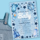 This cute and modern "Blue Jean Baby" boy's baby shower invitation features a light blue jean background with typography lettering and a frame of blue stars, a bottle, denim baby cloths, and a pacifier. The reverse side features a denim pattern. Matching Items in our shop for a complete party theme.