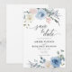 Casamento floral de aquarela salve o cartão de data. Flórida elegante, salve o cartão de data com lindas flores pintadas manualmente em azul claro e cor-de-rosa pincelado com verde e belo roteiro caligráfico. Rosa moderno empoeirado e poeirento azul de casamento floral tropical, salve o cartão de encontro. Você pode personalizar o texto, o estilo da fonte, a cor e o tamanho em frente e atrás do cartão. Por favor, sinta-se à vontade para contactar-me para obter os itens correspondentes.