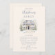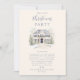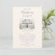 An elegant watercolor Christmas invitation featuring a stately blue manor surrounded by frosted pines and gentle snowfall. The refined pastel palette and soft painterly details bring timeless winter charm to any holiday gathering — perfect for classy celebrations in a cozy, elegant home setting.