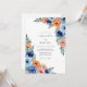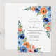 Vibrant watercolor blooms in shades of deep blue, bright orange, and soft coral create a lively floral display. Accompanying green foliage adds a natural, whimsical touch. This design evokes a fresh and celebratory mood.