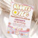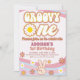 Blue Pink Daisies Peace Sign Groovy One Birthday Invitation Retro style first aniversation call para uma menina com um título decorativo de fontes retrógradas, algumas margaridas e sinal de paz num fundo rosa e azul. Este convite para primeiro aniversario de uma garota é ideal para uma festa de aniversário de 60 ou retrô-lo da primeira.