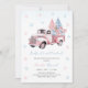 Um gênero de Natal revela convite de festas. A design do festivo inverno apresenta um carregando de caminhão cor-de-água rosa, presentes azul e rosa, árvores de Natal e decorações. O texto da tipografia diz bebê que está frio lá fora. Personalize editando o convite digital ou impresso com os detalhes do evento.