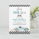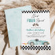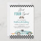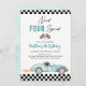 Este adorável convite apresenta um carro azul de corrida de aquarelas com detalhes de chama.