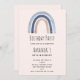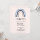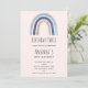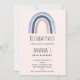 Um convite de aniversário com um arco-íris giro e caprichoso. Cor azul e pêssego.