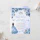Este adorável convite da quinceañera mostra uma fronteira de rosas azuis com folhagem cintilante prateada em fundo azul de aquarela. Uma tiara prateada, uma menina de cabelo escuro em um vestido de princesa azul e pequenas borboletas azuis decoram o texto. A palavra "Quinceañera" e o nome do convidado de honra aparecem num elegante guião azul de escrita manual, com o texto remanescente na fonte serif cinza.