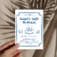 Invite friends and family with this charming blue sketch-style birthday invitation, featuring playful hand-drawn illustrations of a birthday cake, utensils, and a slice of cake. The bold, child-friendly font and simple blue border create a fun and inviting look perfect for kids and teens alike.